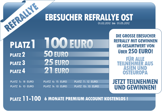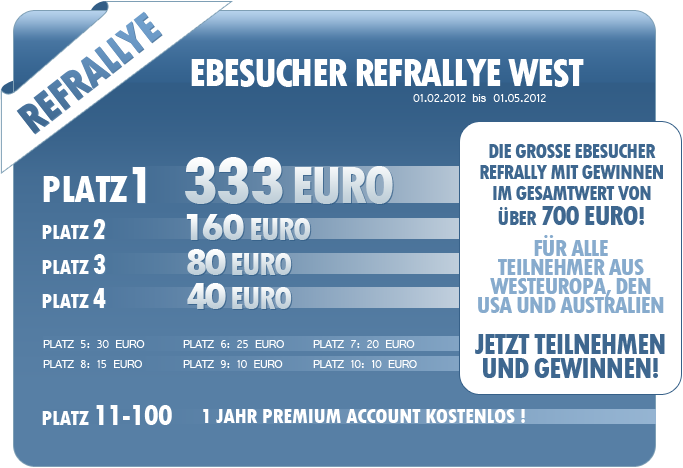 Am 01.02.2012 ist es so weit, wir starten die erste Ref-Rallye in der eBesucher-Geschichte, wo Sie Gewinne im Gesamtwert von über 1000 EURO absahnen können! Außerdem werden mehrere Ref-Ralley Gewinner mit einem Premium-Account ausgezeichnet!