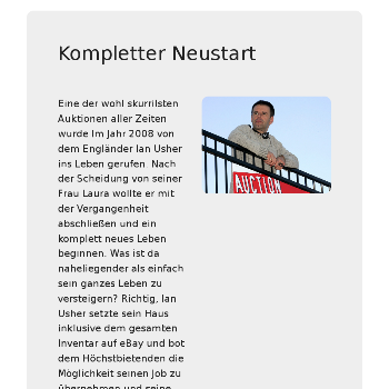 Die Auktionswelt hat inzwischen völlig neue Dimensionen angenommen und man könnte fast sagen: "Es gibt nichts, was es nicht gibt." Hier bekommen Sie einen guten Überblick zu den Themen Online Auktion, Zoll Auktion, Justiz Auktion oder Live-Auktion. Auch wenn Sie selbst nicht an einer Versteigerung teilnehmen wollen, können Sie sich zur Erheiterung in unsere witzigsten Auktions-Geschichten rund um den Globus reinlesen.